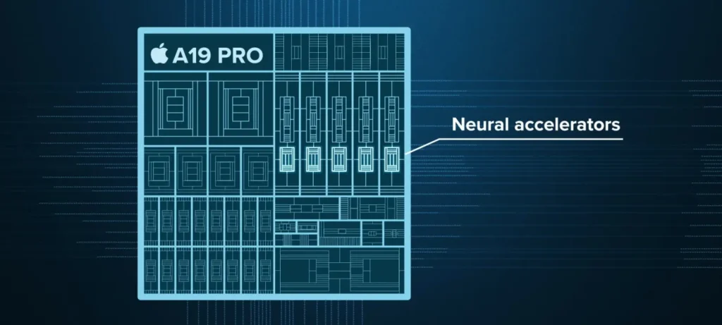 • معالج A19 Pro يتضمن مسرّعات عصبية مدمجة في كل نواة GPU، ما يزيد من قوة المعالجة المخصصة لأعباء الذكاء الاصطناعي.