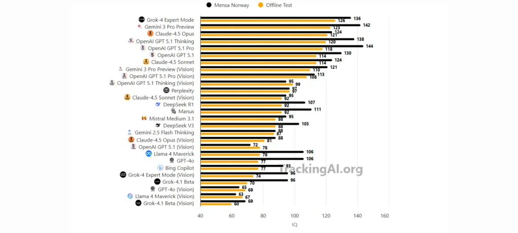 سجّل Gemini 3 Pro من Google نتيجة 130 نقطة على اختبار “Offline IQ test” الذي يجريه موقع Tracking AI، متقدّماً على Grok 4 Expert Mode الذي حقق 126 نقطة. هذه النتيجة أثارت نقاشاً واسعاً على الإنترنت، بما في ذلك في Reddit وغيرها من المجتمعات التقنية.