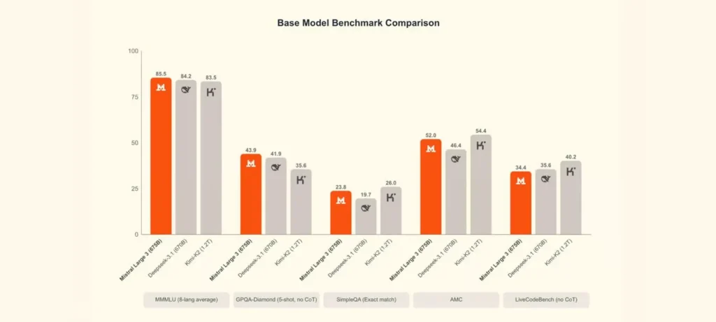 - النموذج الأكبر Large 3 يقدم أداءً منافساً للنماذج غير المتخصصة في الاستدلال مثل Qwen3 وKimi-2 وDeepSeek V3.1، مع دعم متعدد الوسائط واللغات.
