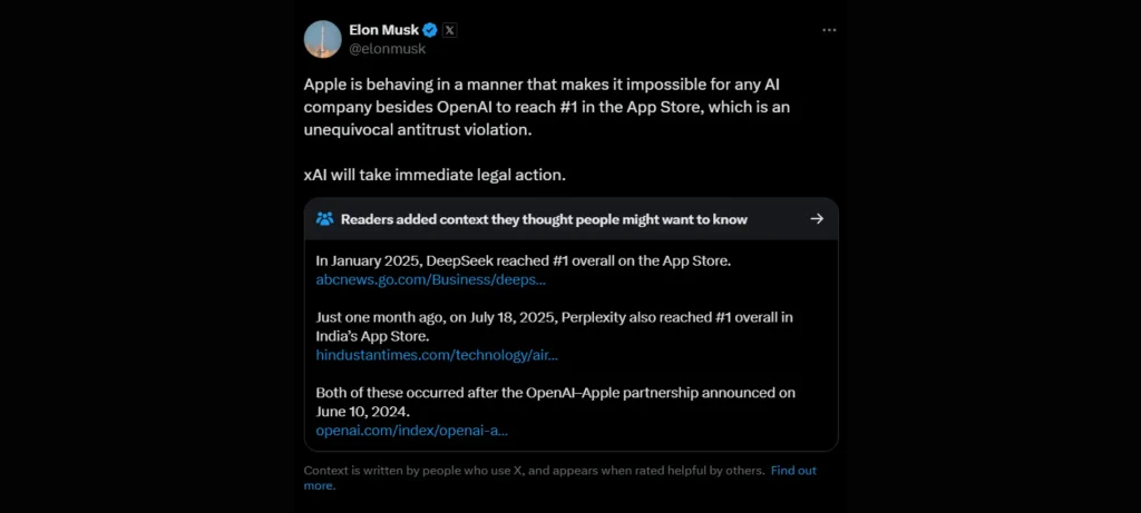 أعلن إيلون ماسك على منصة X أن شركة xAI تتخذ إجراءات قانونية ضد أبل، متهمًا إياها بدفع منتجات أوبن أيه آي في متجر التطبيقات وقمع المنافسين مثل Grok.