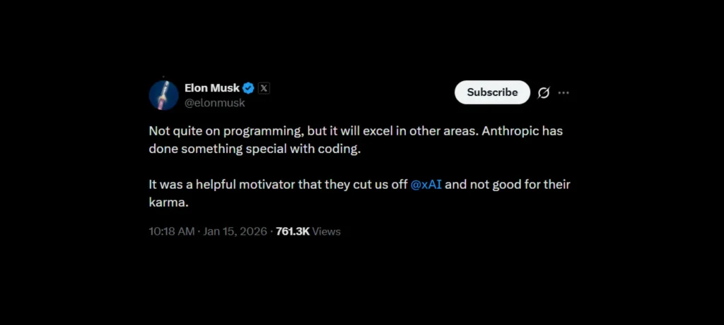 - أشار ماسك إلى أن قطع xAI من قبل Anthropic كان دافعًا محفزًا لفريقه، لكنه اعتبر أن ذلك قد يؤثر على “الكارما” أو السمعة المستقبلية للشركة.