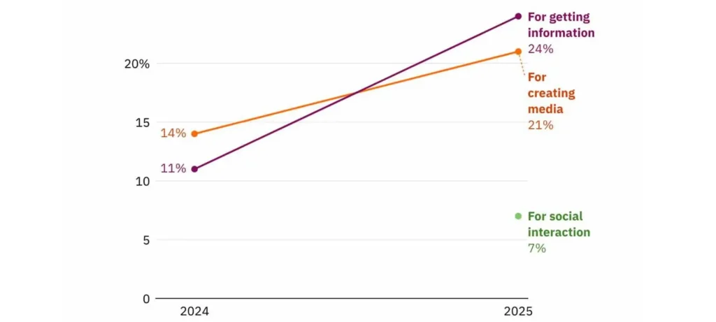 • 24% من المستخدمين يستخدمون الذكاء الاصطناعي للبحث وطرح الأسئلة، مقابل 21% يستخدمونه لإنشاء النصوص أو الصور أو الأكواد.