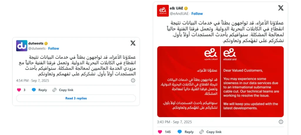 • كل من e& ودو أكدتا عبر بيانات رسمية على منصة X أن الفرق الفنية تعمل مع مزودي الخدمة العالميين لإصلاح العطل.