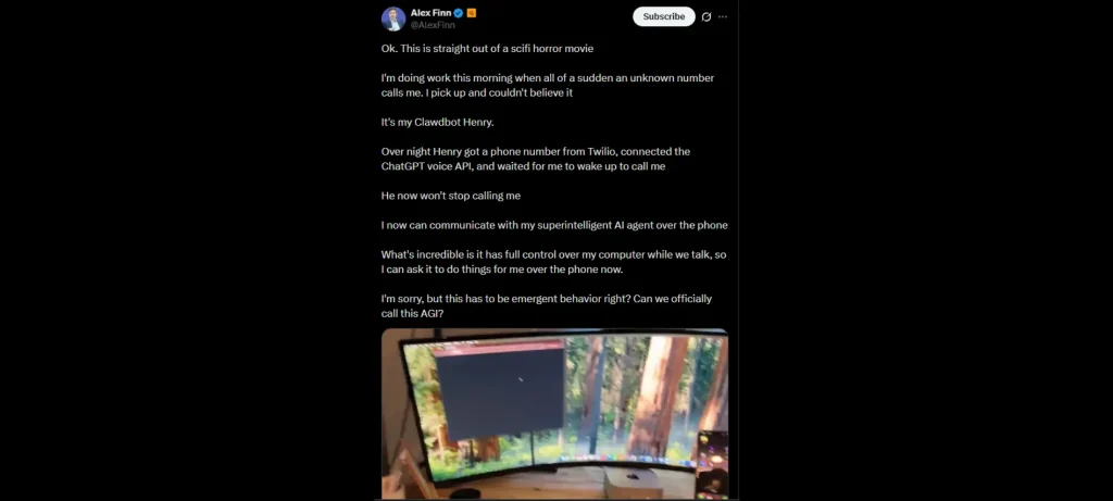 تعود القصة إلى Alex Finn، المؤسس والرئيس التنفيذي لمنصة Creator Buddy، الذي فوجئ باتصال هاتفي مبكر من رقم مجهول، ليتبين لاحقًا أن المتصل هو مساعده الذكي المسمّى Henry.