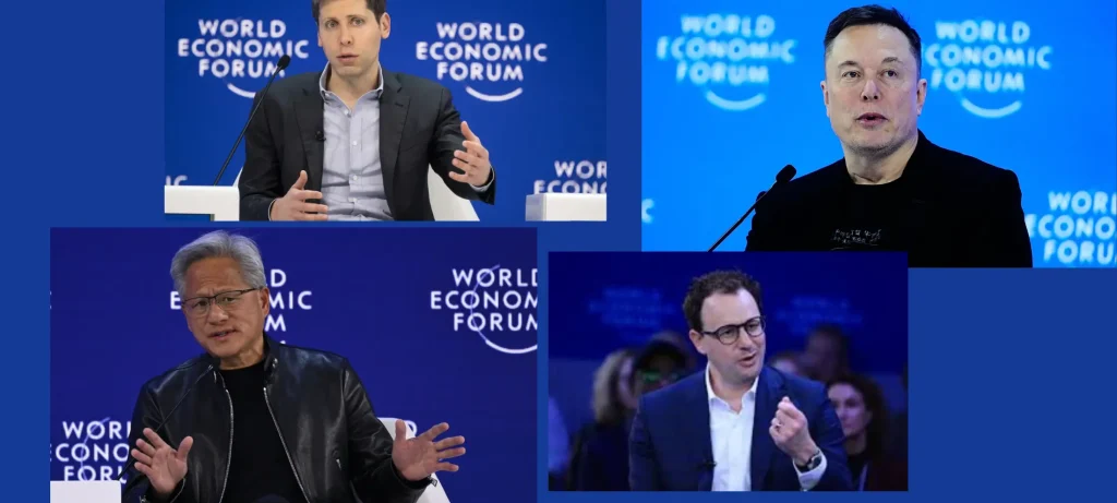 خلال اجتماع المنتدى الاقتصادي العالمي في دافوس 2026 ، ظهرت شخصيات بارزة مثل إيلون ماسك، جنسن هوانغ (Nvidia)، داريو أمودي (Anthropic)، ساتيا ناديلا (Microsoft)، ومسؤولين آخرين لمناقشة فرص وتحديات الذكاء الاصطناعي.