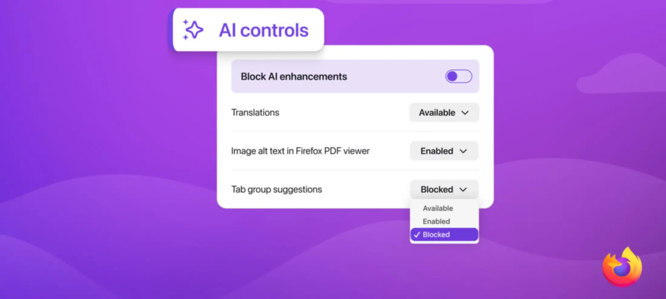 ابتداءً من إصدار فايرفوكس 148، المقرر إطلاقه في 24 فبراير، سيظهر قسم جديد مخصص للتحكم في الذكاء الاصطناعي ضمن إعدادات نسخة سطح المكتب، ويتضمن: