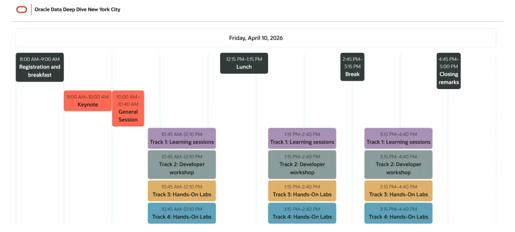 تنظم Oracle فعالية Oracle Data Deep Dive ضمن جولة Oracle AI World Tour، والتي ستُقام في مدينة New York City داخل مركز Jacob K. Javits Convention Center.
