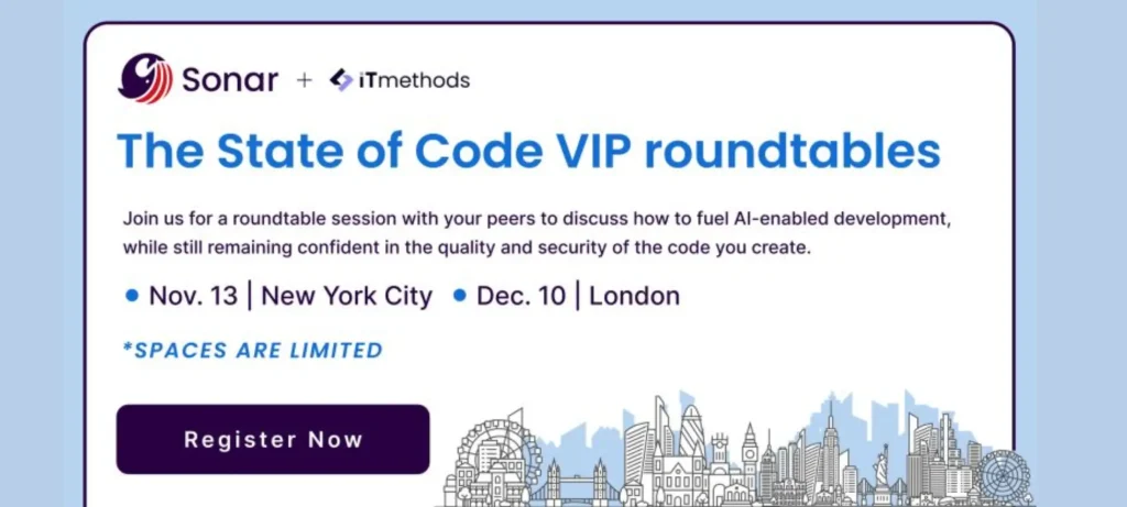 تستضيف شركة Sonar فعالية State of Code Roundtable في نيويورك يوم 13 نوفمبر، لمناقشة مفارقة إنتاجية الذكاء الاصطناعي في البرمجة، وكيفية تحسين جودة الكود في عصر السرعة الرقمية.