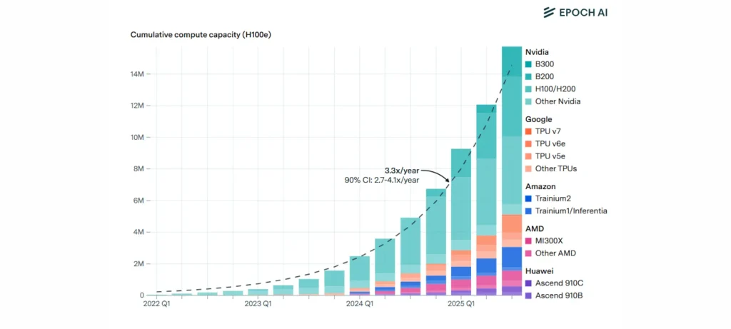 - نمو سنوي متسارع: إجمالي القدرة الحاسوبية المتاحة من شرائح الذكاء الاصطناعي ينمو بمعدل يقارب 3.3 مرات سنويًا منذ عام 2022، وهو ما يعادل تضاعفًا كل 7 أشهر تقريبًا.