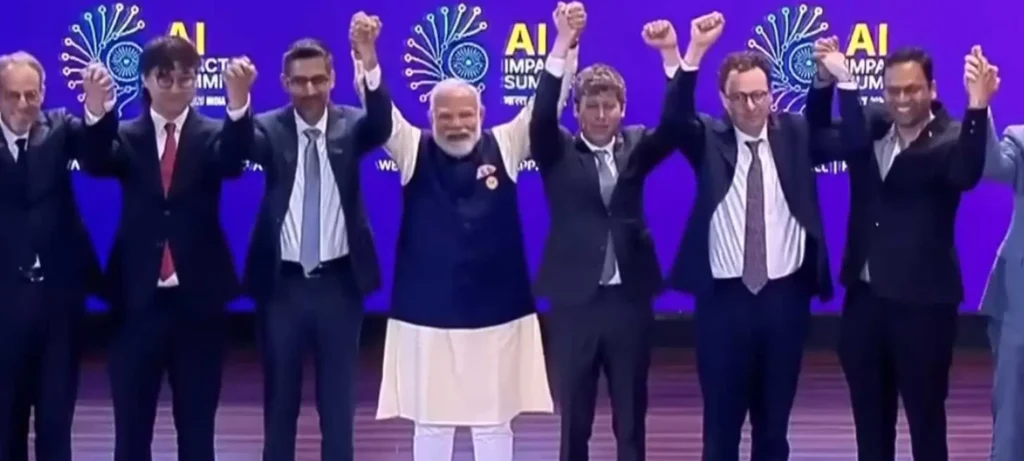 • دعا Modi قادة التكنولوجيا لتشكيل سلسلة يدوية مرتبطة، حيث رفع ذراعيه مع Altman وPichai، بينما رفع Altman وAmodei قبضتيهما بدلاً من ذلك.