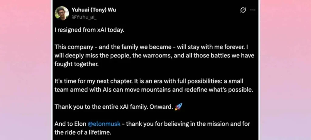 - توني وو يغادر xAI: نشر وو على X أنه حان الوقت لفتح “فصل جديد”، مشيراً إلى أن فريقاً صغيراً مزوداً بالذكاء الاصطناعي يمكنه تحقيق إنجازات هائلة. وو كان مسؤولاً عن جهود الاستدلال في نموذج Grok وتابع أعماله مباشرة مع ماسك، وانتقل إلى xAI من جوجل في 2023.