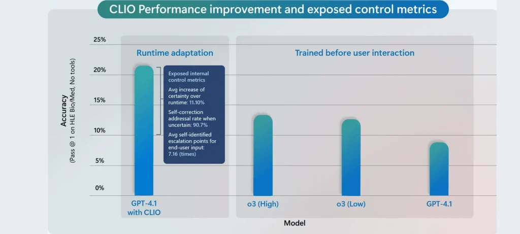 - في اختبار Humanity’s Last Exam، رفع CLIO دقة GPT-4.1 في الأسئلة الطبية الحيوية النصية من 8.55% إلى 22.37%، متفوقًا على نموذج o3.