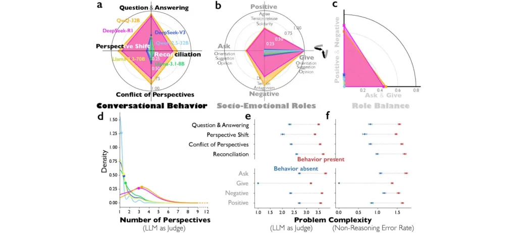 أظهرت الدراسة أن نماذج الاستدلال مثل DeepSeek-R1 وQwQ-32B تتميز عن نماذج الذكاء الاصطناعي التقليدية باتباعها نقاشاً داخلياً بين شخصيات افتراضية متعددة، تشمل خبراء ومراجعين داخليين، بدلًا من التسلسل الأحادي الذي تتبعه نماذج مثل DeepSeek-V3 وQwen-2.5. وتشمل أهم الملاحظات: