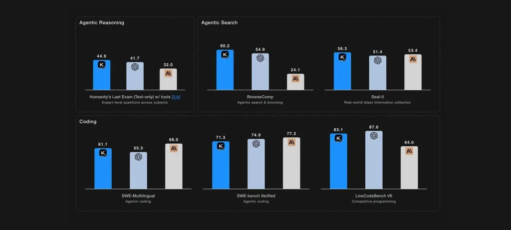 - تفوق Kimi على GPT-5 وClaude 4.5 Sonnet في عدة اختبارات للذكاء التحليلي والوكالة (Agentic Benchmarks).
