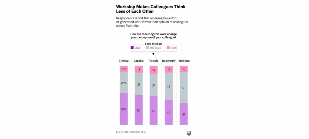 • التأثير على التعاون: الموظفون الذين يستقبلون workslop يرون زملاءهم أقل موثوقية وإبداعاً وكفاءة.