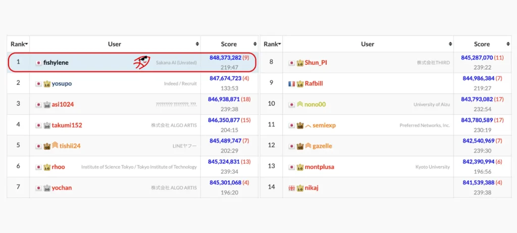 أعلنت Sakana AI أن وكيلها الذكي ALE-Agent حقق المركز الأول في مسابقة AtCoder Heuristic Contest 058، متفوقًا على 804 مشاركًا بشريًا، ليصبح أول وكيل ذكاء اصطناعي يفوز بمسابقة برمجية منافسة في الوقت الحقيقي.