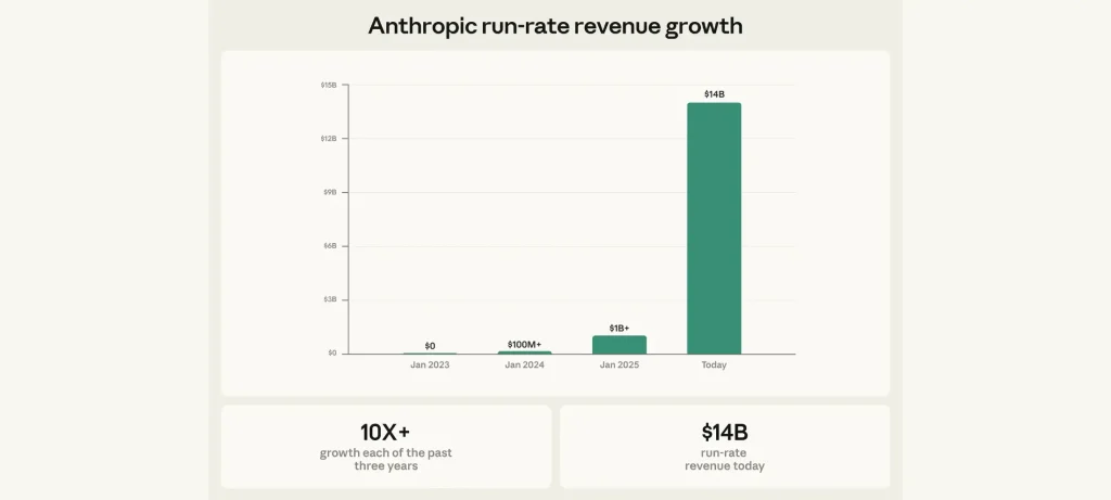 أعلنت Anthropic عن جولة تمويل Series G بقيمة 30 مليار دولار، لتصل قيمتها السوقية بعد التمويل إلى 380 مليار دولار، مع تحقيق معدل إيرادات سنوي قدره 14 مليار دولار، 2.5 مليار منها من Claude Code وحده.