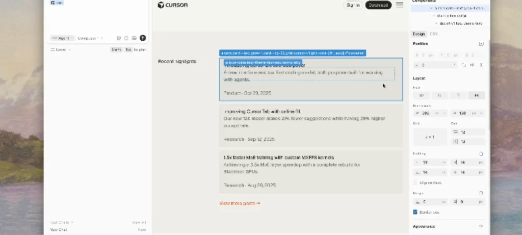 قدمت شركة Cursor محررًا بصريًا جديدًا يتيح للمطورين سحب وإفلات عناصر واجهة المستخدم وإعادة ترتيبها، بينما تقوم وكلاء الذكاء الاصطناعي بتحديث الكود تلقائيًا، موحدًا بين التصميم والتنفيذ.