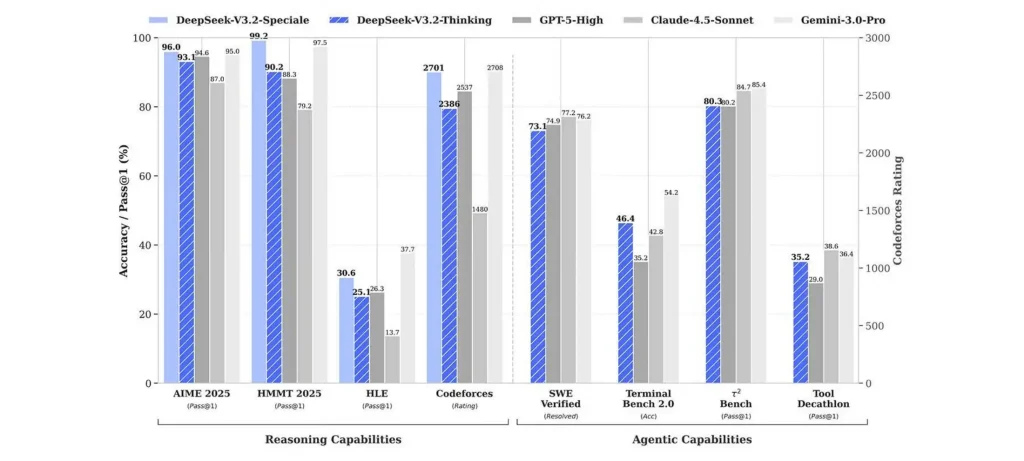 - نموذج V3.2 يحقق أداءً قريباً من نماذج متقدمة مثل GPT-5 وGemini 3 Pro في مهام الرياضيات، التفكير المنطقي، البرمجة، وتحليل السياقات الطويلة.