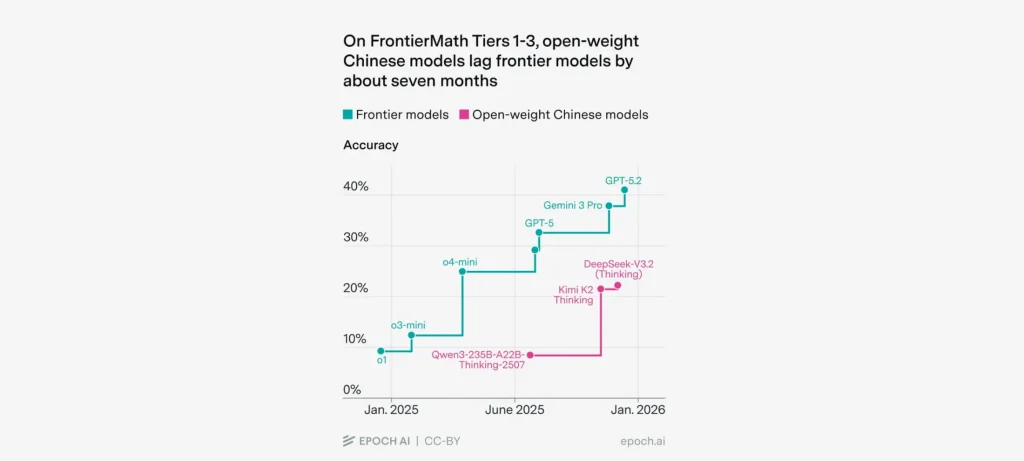 نشرت Epoch AI نتائج تقييم النماذج الصينية مفتوحة الوزن باستخدام معيار FrontierMath للرياضيات. وأظهرت النتائج أن هذه النماذج تتأخر تقريبًا سبعة أشهر عن النماذج الحدودية (frontier models) في المستويات الأساسية والمتوسطة (Tiers 1-3).