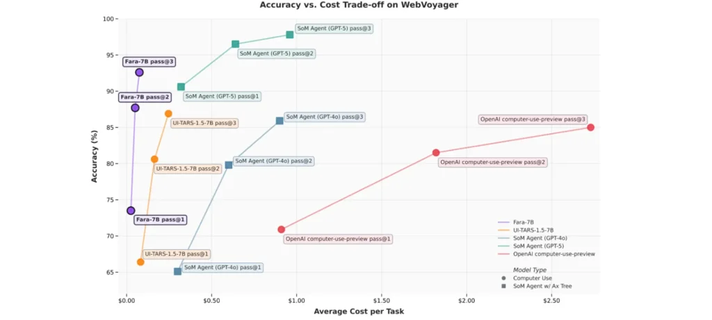 • Fara-7B هو نموذج SLM قادر على استخدام الواجهة الرسومية مثل الماوس ولوحة المفاتيح لإنجاز مهام الويب تلقائيًا.