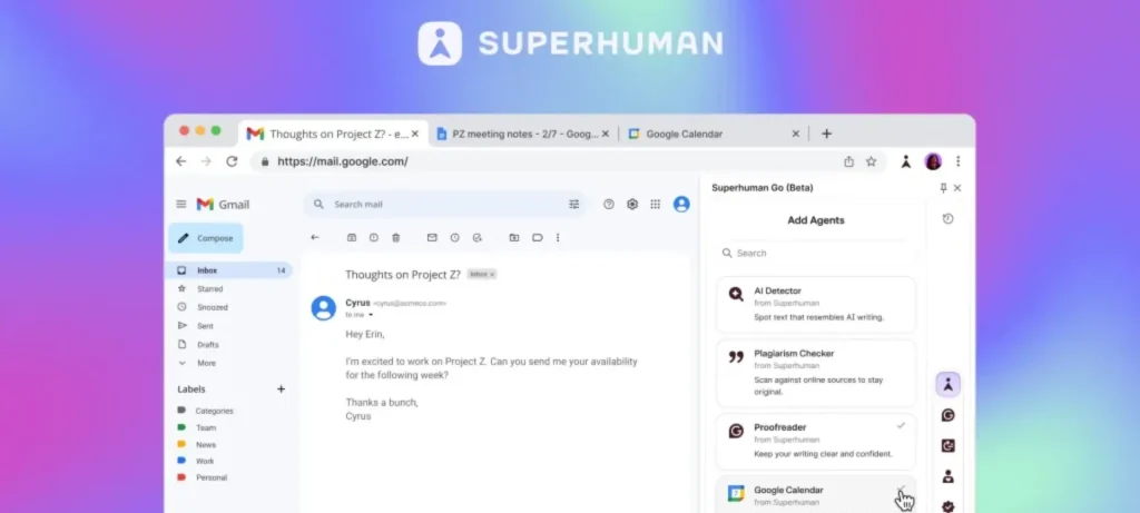 • Superhuman Go هو مساعد يعتمد على وكلاء (agents) داخليين وخارجيين، يعمل في الخلفية ضمن التطبيقات، ويقترح وينفذ مهامًا مثل البريد الإلكتروني، التقويم، والبحث عبر أكثر من 100 تطبيق.