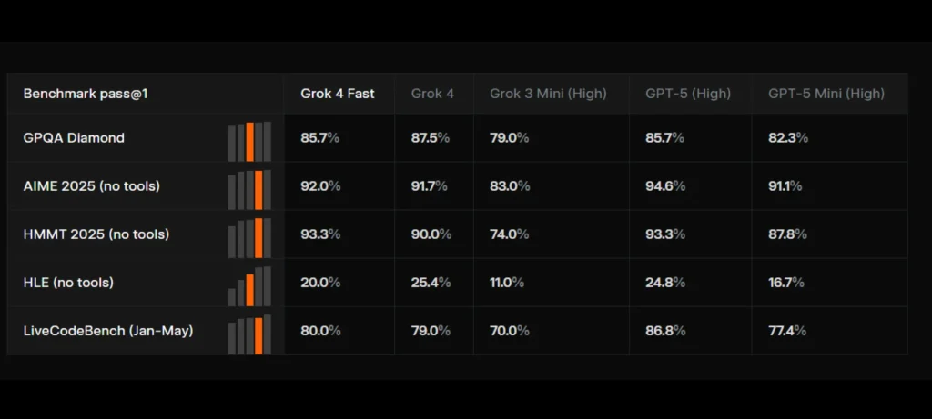 أظهرت الاختبارات أن Grok 4 Fast يتفوق على Grok 3 Mini في العديد من المعايير، مع تقليل تكاليف الرموز بنسبة تصل إلى 98% لتحقيق نفس الأداء. كما أظهرت مراجعة مستقلة من Artificial Analysis أن النموذج يقدم نسبة ذكاء إلى تكلفة رائدة مقارنة بالنماذج المتاحة علنًا.