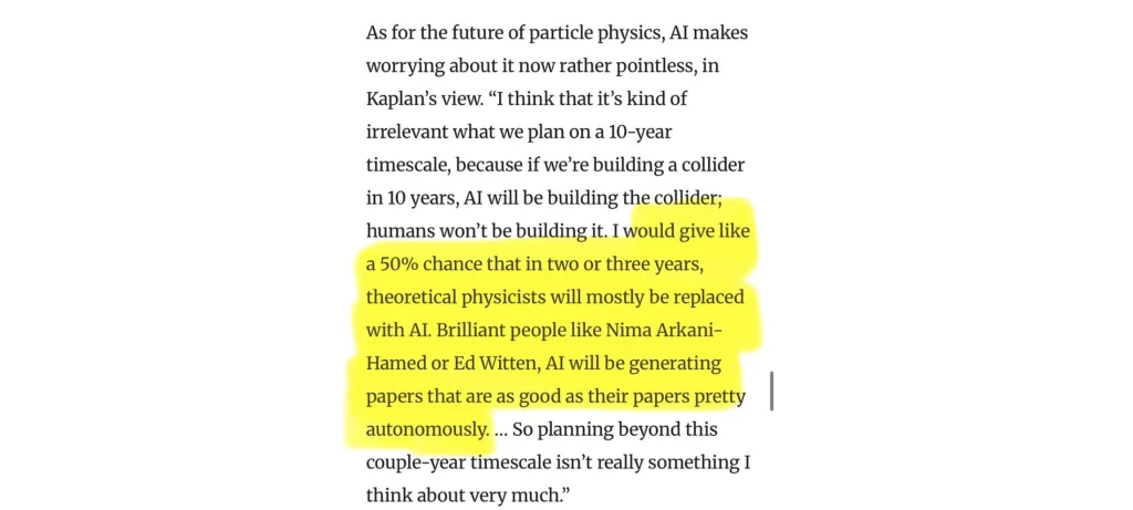 يتوقع Jared Kaplan، الفيزيائي النظري والشريك المؤسس لشركة Anthropic، أن هناك احتمالًا يقارب 50% أن يحل الذكاء الاصطناعي محل معظم الفيزيائيين النظريين البارزين خلال العامين إلى الثلاثة القادمة، مستندًا إلى خبرته في كل من الفيزياء وأبحاث الذكاء الاصطناعي.