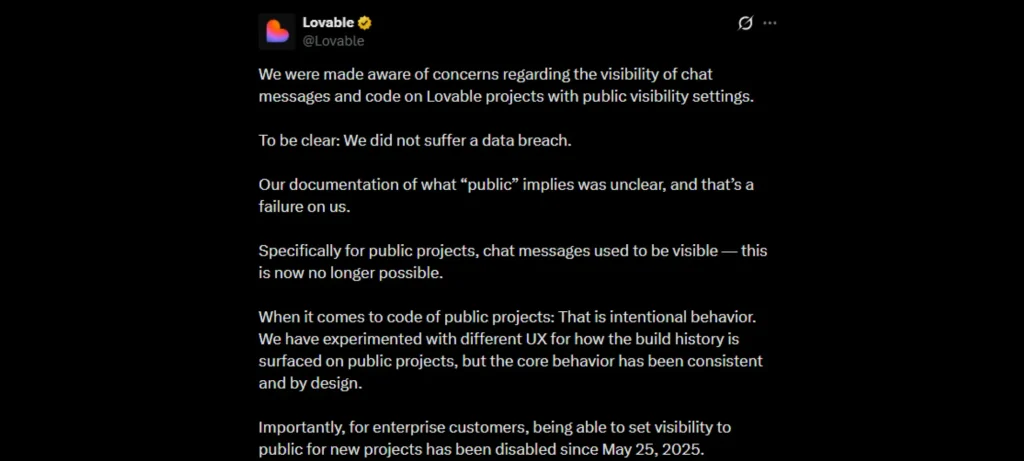 أوضحت شركة Lovable حقيقة الجدل الذي أثير مؤخرًا حول ظهور محادثات ومحتوى مشاريع المستخدمين، مؤكدة أن ما حدث لم يكن اختراقًا أمنيًا بل نتيجة سوء توضيح في الإعدادات.