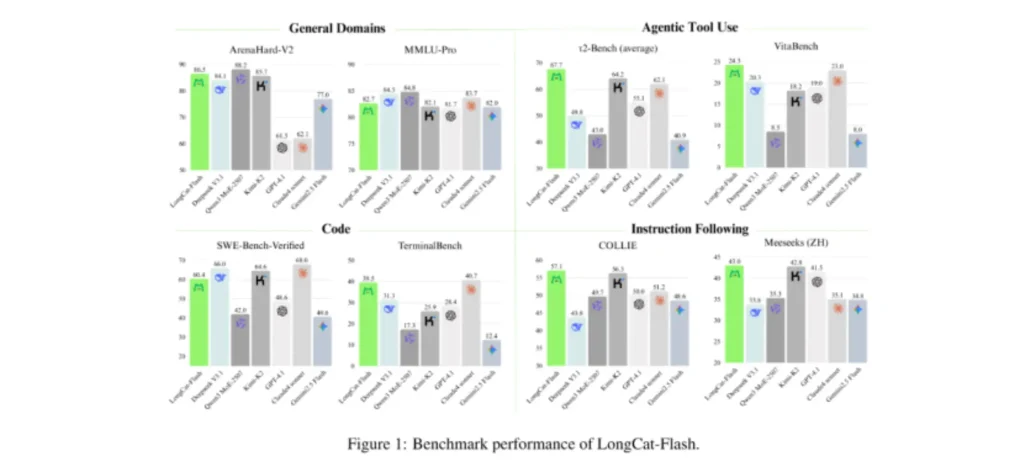 وفق التقرير الفني، يقدم LongCat-Flash-Chat أداءً تنافسياً للغاية مقابل أحدث النماذج العالمية مثل GPT-4.1 وClaude 4 Sonnet وGemini 2.5 Flash، مع تميز خاص في المهام الوكيلية (Agentic Tasks).