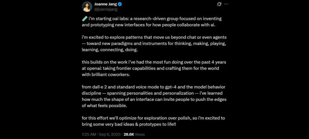 أعلنت Joanne Jang، رئيسة فريق سلوك النماذج في OpenAI، عن تأسيس OAI Labs، وهو فريق بحثي مخصص لابتكار وتجربة واجهات جديدة للتعاون بين البشر والذكاء الاصطناعي.