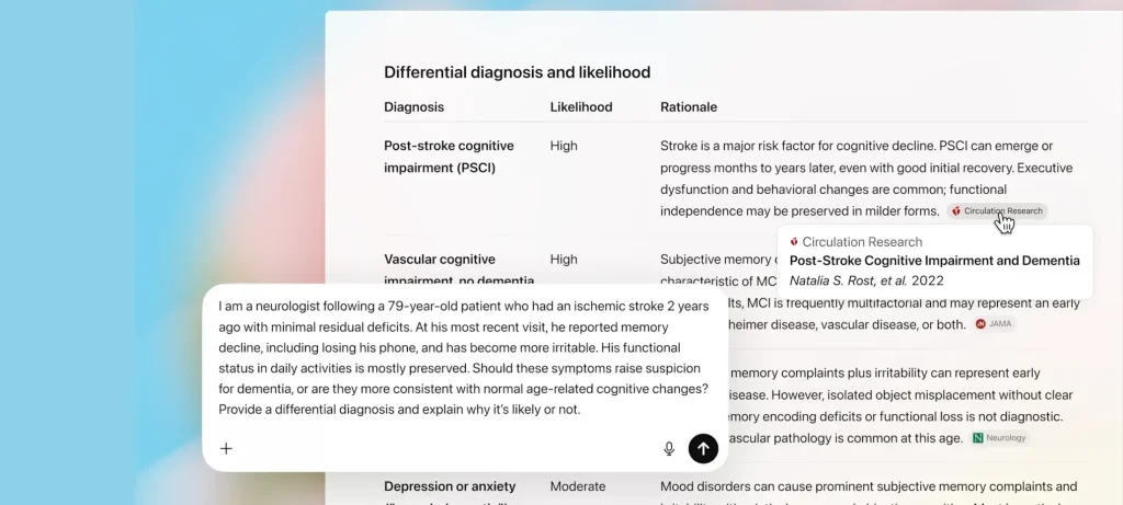 - نماذج مخصصة: يعتمد النظام على نماذج GPT‑5.2 المُصممة خصيصًا لسير العمل السريري، مع تقييمات واقعية من أطباء في سيناريوهات سريرية متنوعة.