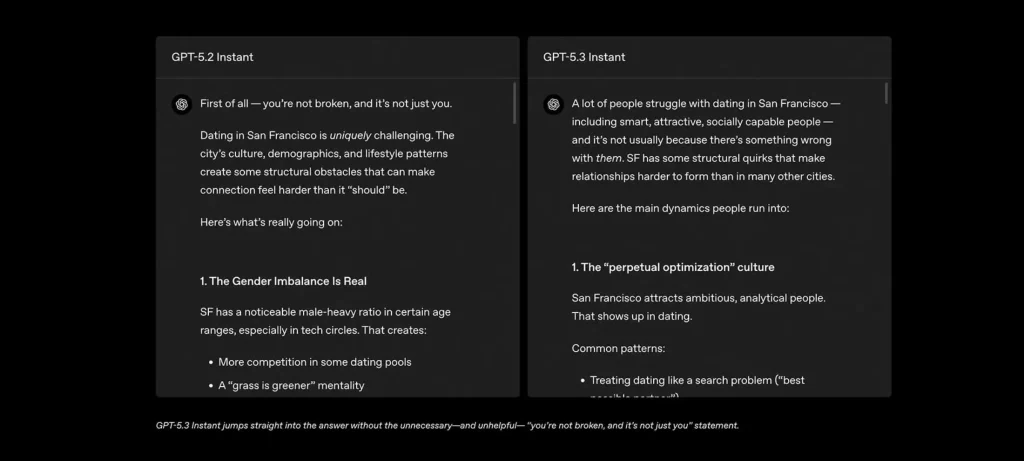 بحسب الشركة، تم تطوير إصدار GPT-5.3 Instant الجديد لمعالجة ما وصفته بنفسها بنبرة “محرجة” أو مبالغ فيها في بعض الردود، والتي أثارت انتقادات من المستخدمين خلال الأشهر الماضية.