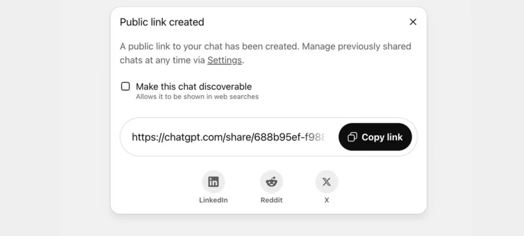 - الميزة كانت اختيارية (opt-in) وتطلب من المستخدم تحديد محادثة ثم تفعيل خيار “مشاركة مع محركات البحث”.