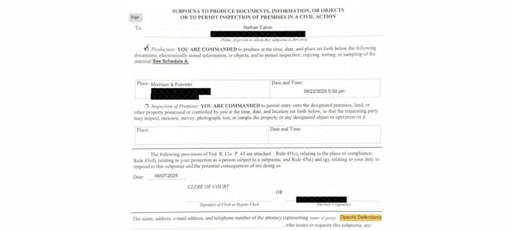 - يُزعم أن OpenAI سلَّم في أحد الليالي مذكرة استدعاء لناثان كالفن، محامي من Encode، أثناء جلوسه لتناول العشاء، عبر معاون شريف.