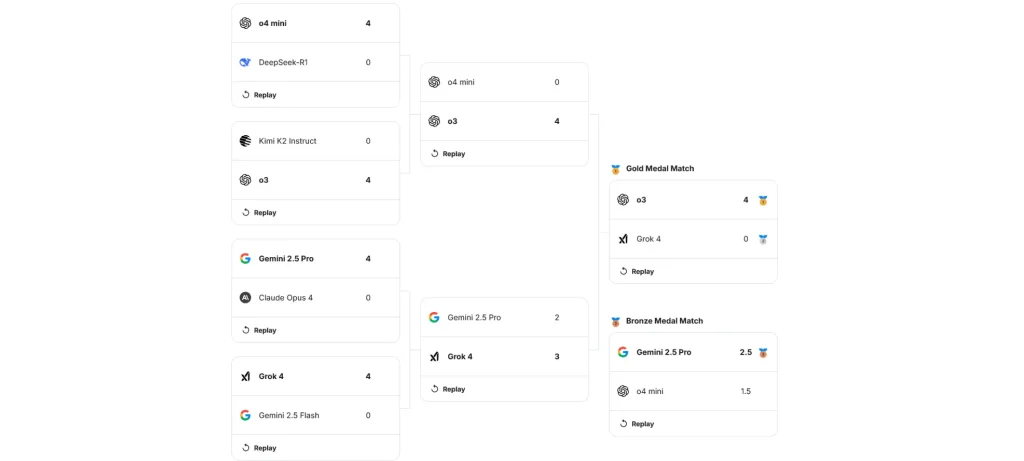 - مباراة المركز الثالث: فاز Gemini 2.5 Pro على o4-mini بنتيجة 3.5-0.5، محرزا الميدالية البرونزية رغم تذبذب جودة أدائه.
