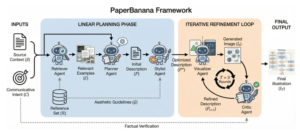 يقدم PaperBanana نموذجًا جديدًا لأتمتة واحدة من أكثر مراحل البحث العلمي استهلاكًا للوقت، وهي تصميم الرسوم التوضيحية والمنهجيات البصرية، وذلك عبر محاكاة أسلوب عمل المصممين البشر باستخدام عدة وكلاء ذكاء اصطناعي متعاونين.