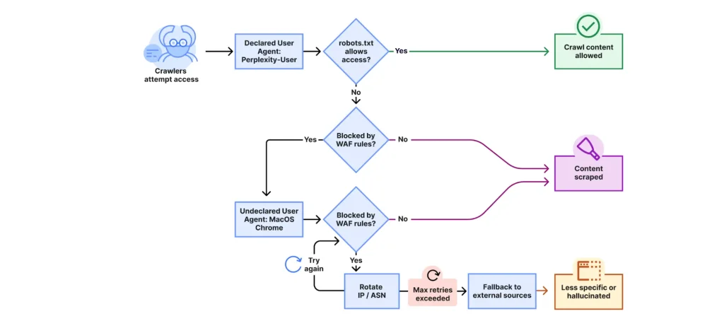 في تقرير نُشر بتاريخ 4 أغسطس 2025، كشف باحثون من Cloudflare عن استخدام منصة Perplexity AI لأساليب مراوغة لتجاوز سياسات منع الزحف التي تحددها المواقع الإلكترونية: