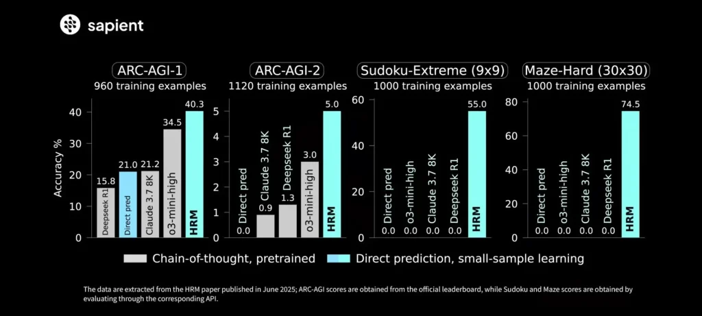• تفوق النموذج على نماذج أكبر مثل Claude 3.7 و DeepSeek R1 و o3-mini-high في اختبارات ARC-AGI 2 والألغاز المعقدة مثل السودوكو والمتاهات.